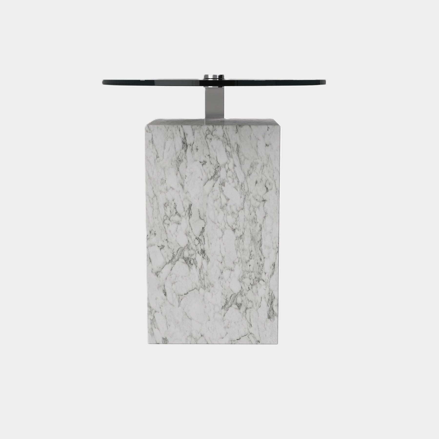 This statement-making side table features a rectangular marble base with unique natural veining, topped with a sleek metal surface. Its modern silhouette and contrasting materials create a striking focal point for your living area.